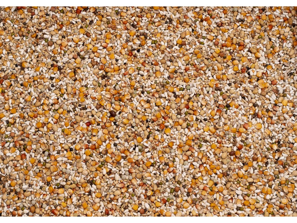 Složení: Extra bílý cirok (dari), drobná kukuřice cribs, kardi (světlice barvířská), neloupaná rýže (paddy), červený cirok (milo), bílá pšenice, konopné semeno, kukuřice merano, toustovaná sója, vikev, drobný zelený hrách, drobný žlutý hrách, mungo fazole, loupaná slunečnice, černá řepka, lněné semínko, loupaný oves, loupaný ječmen, pohanka, hnědý hrách (dun peas), javorový hrách (peluška), čočka, hnědá rýže.