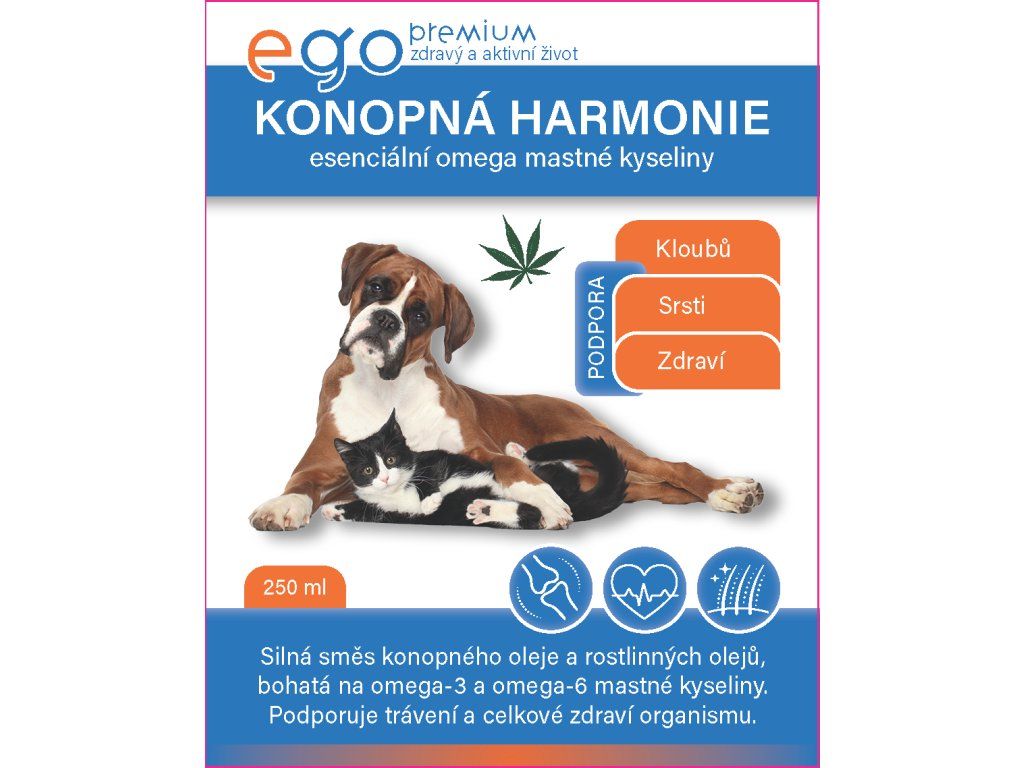 Dopřejte svému psovi či kočce sílu přírodních olejů. Ego Premium Konopná Harmonie je prémiový doplňkový olej, který kombinuje konopný olej s dalšími rostlinnými oleji pro maximální účinek. Je ideálním každodenním doplňkem pro podporu celkového zdraví, hybnosti a krásného vzhledu vašeho mazlíčka.