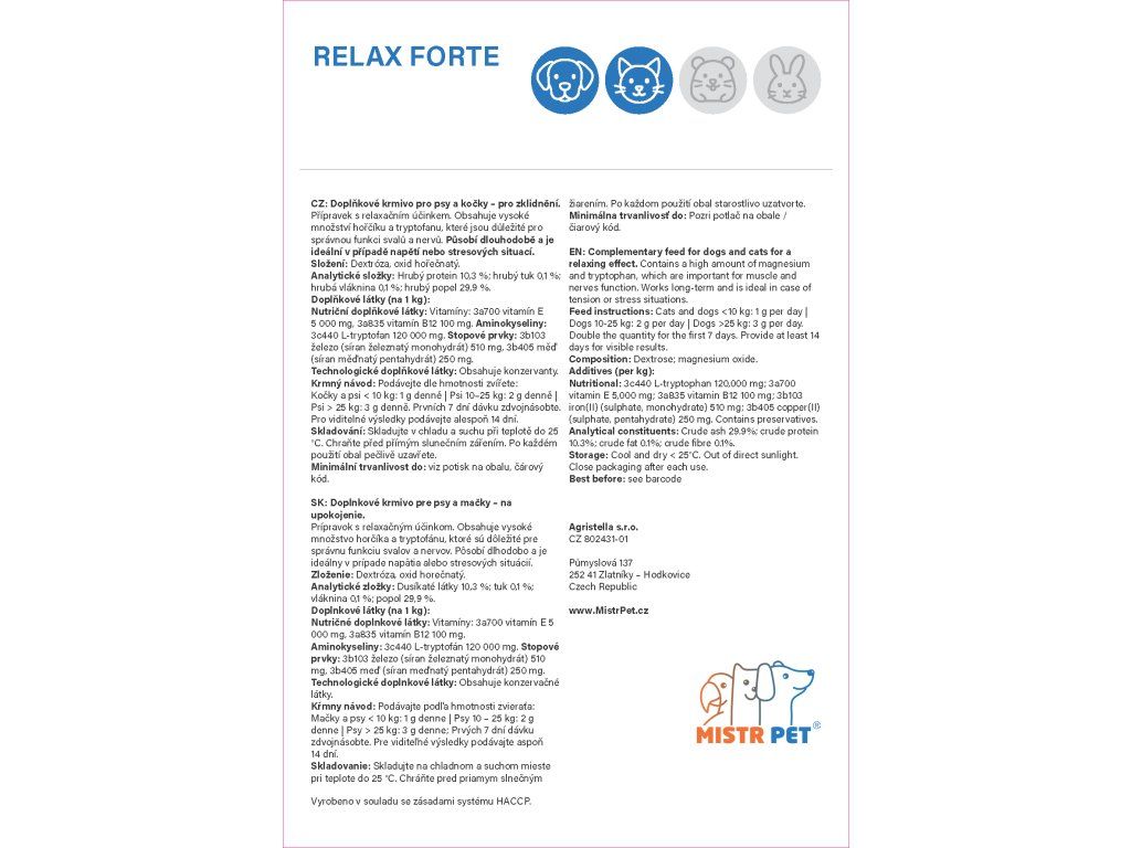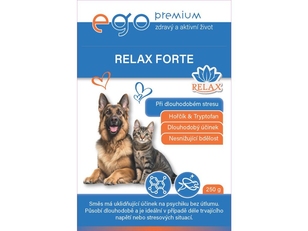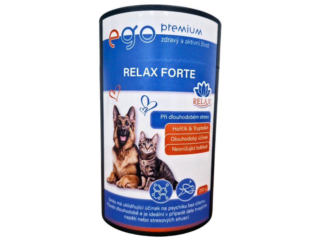 Ego Premium Relax Forte je určen pro zvířata, která čelí přetrvávajícím stresovým situacím, jako je úzkost ze samoty, nervozita z hlasitých zvuků nebo celková plachost. Pro dosažení viditelného výsledku je doporučeno podávat přípravek minimálně 14 dní. V prvním týdnu se dávka zdvojnásobuje, aby se v těle rychle vytvořila potřebná hladina účinných látek. Poté se pokračuje v udržovací dávce, která zajišťuje stabilní psychickou pohodu vašeho mazlíčka.