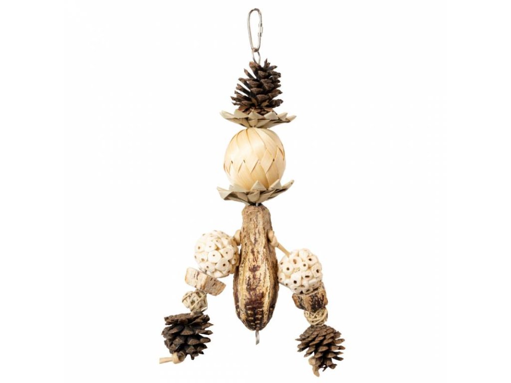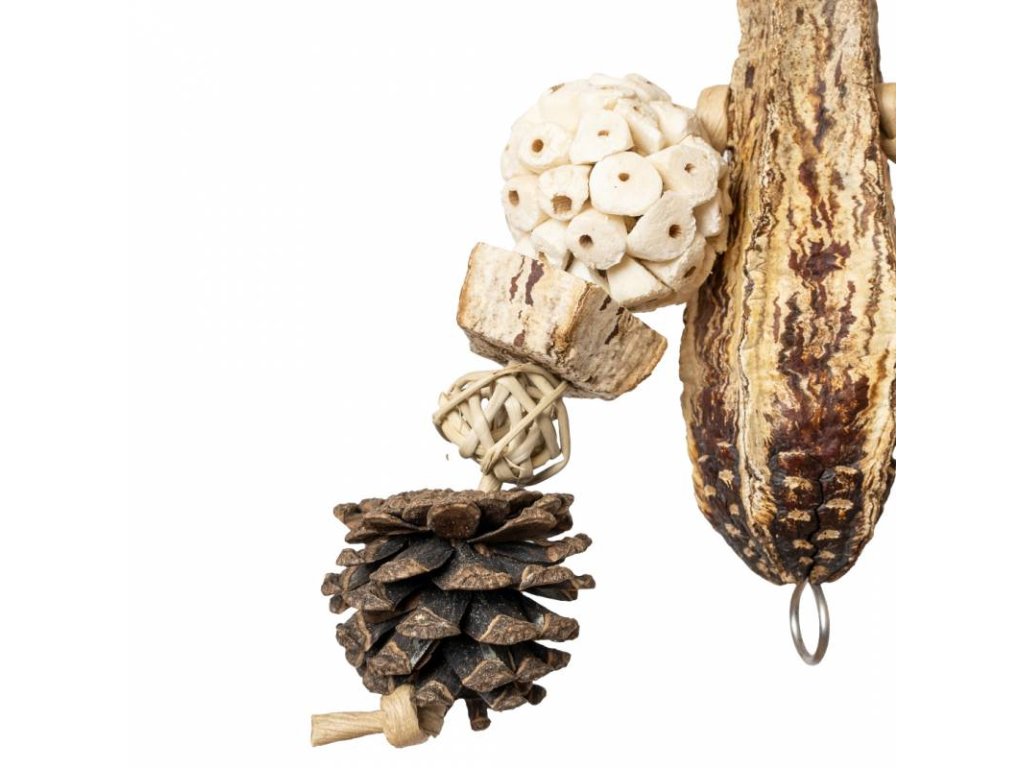 Back Zoo Nature Forest Balls je veselá girlanda vyrobená z mahagonového lusku, šišek, sola dřeva a pletených hvězd. Svačinku pro vašeho papouška lze schovat mezi šupiny borové šišky a do otvorů ve dřevě sola, takže hra a shánění potravy se dokonale propojí. To vše zajistí, že váš malý kamarád bude žít aktivním životním stylem a nebude se nudit.