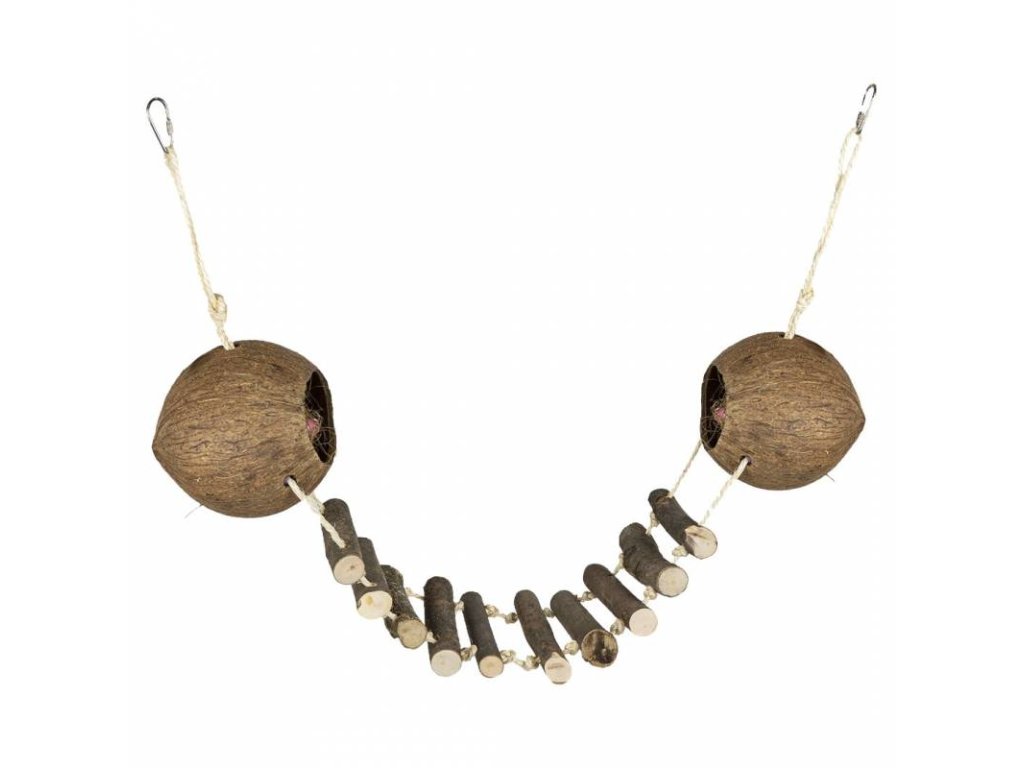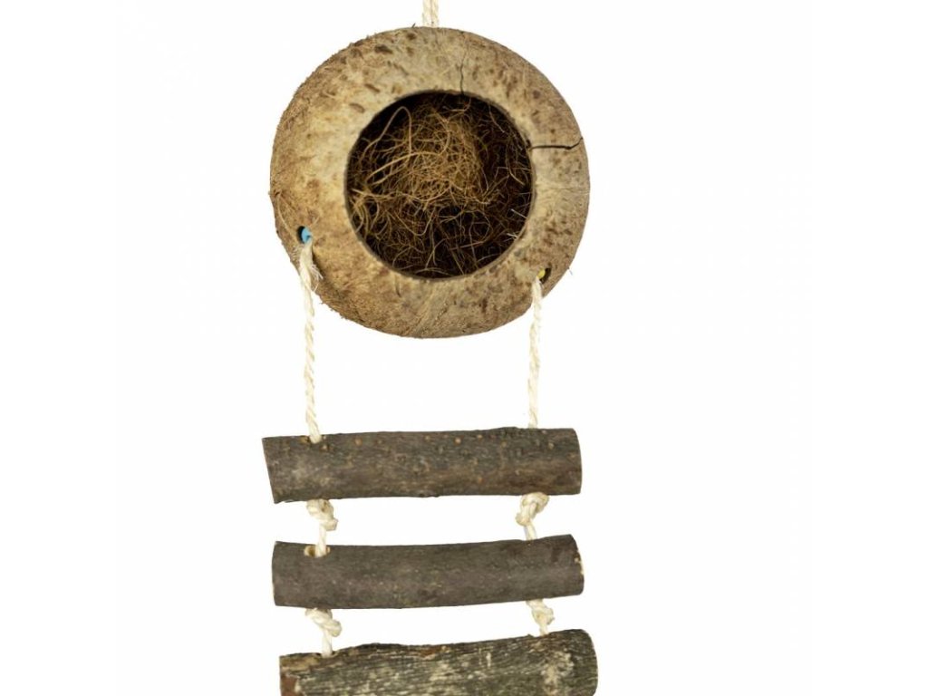 Konstrukce: Základem je dvojice přírodních kokosových ořechů, které fungují jako domečky. Ty jsou propojeny dřevěným žebříkem a celá sestava visí na pevném sisalovém. Celková délka dosahuje úctyhodných 104 cm.