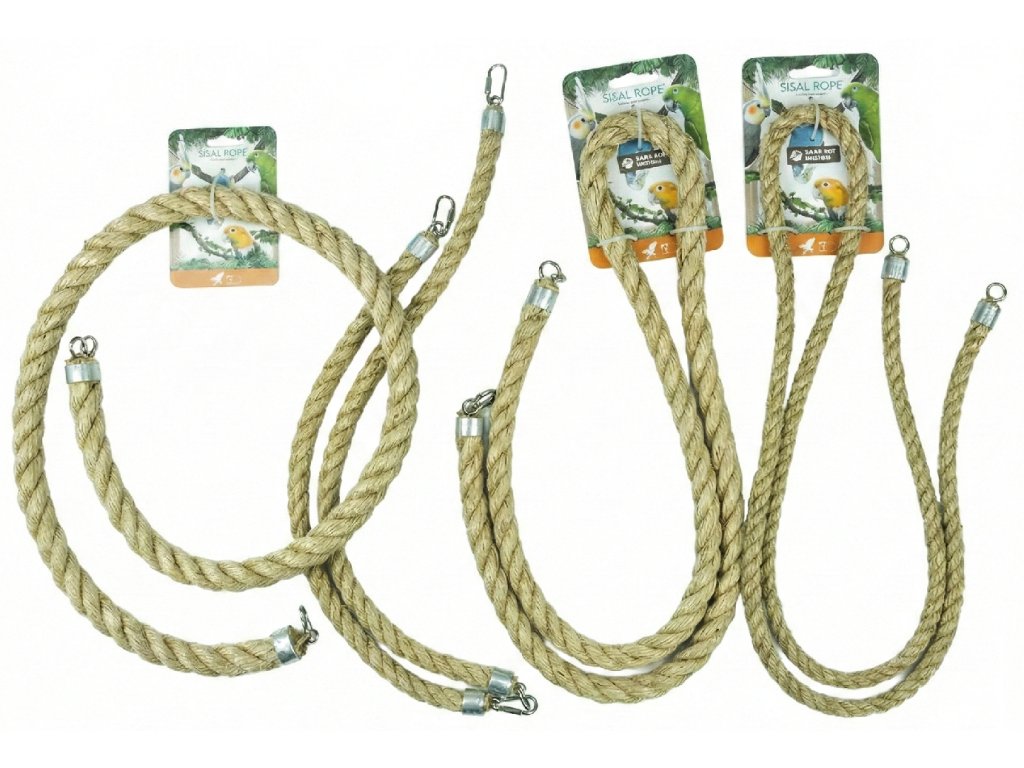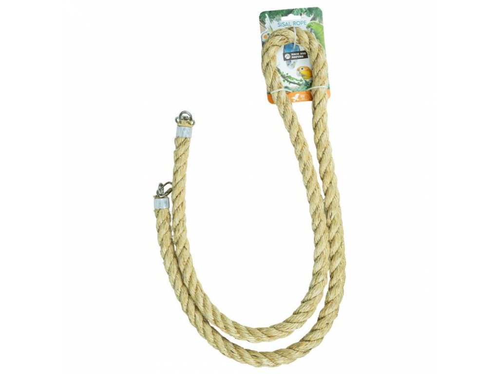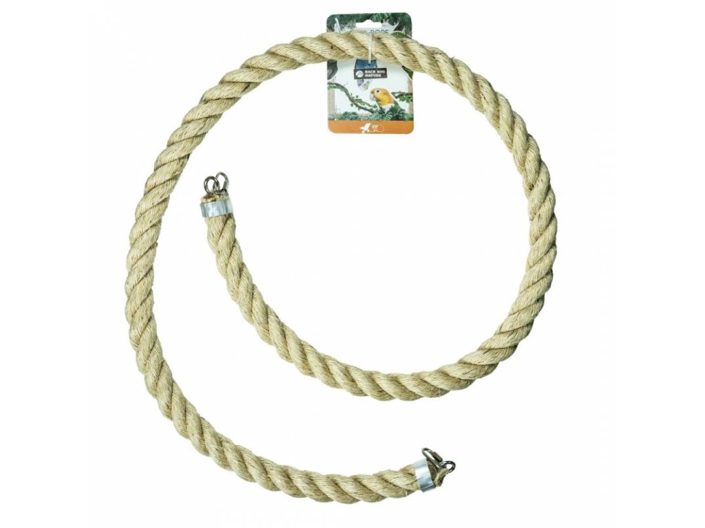 Návod k použití: Lano zavěste pomocí kovových háků/ok na protilehlé strany klece pro vytvoření mostu, nebo svisle jako šplhací lano. Pravidelně kontrolujte, zda se do uvolněných vláken nemohou zamotat drápky (případně dlouhá vlákna zastřihněte).