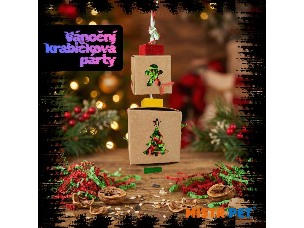 Je to jako mrakodrap zábavy, který čeká na Godzillu (vašeho papouška). Uvnitř krabiček s vánočními motivy najde spoustu barevného skartovaného papíru, který přímo žadoní o vytažení a rozházení po celém pokoji. Dřevěné bloky mezitím poslouží jako odolná překážka pro trénink silného zobáku.