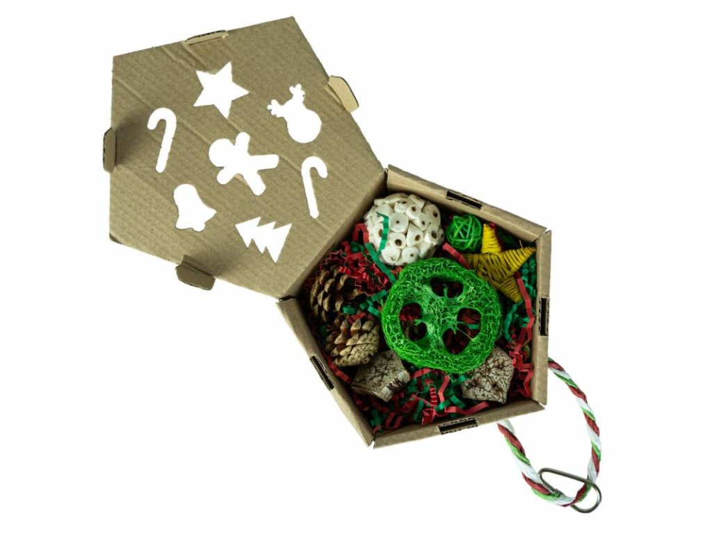 Tato kouzelná krabička s vánočními motivy je mimo jiné napěchovaná barevnými papírovými proužky. Ale to není vše! Uvnitř se skrývají přírodní hračky: šiška, vrbová hvězda a sola míček. Je to jako "Kinder vajíčko" pro papoušky, jen místo hračky najdou... další hračky na ničení!